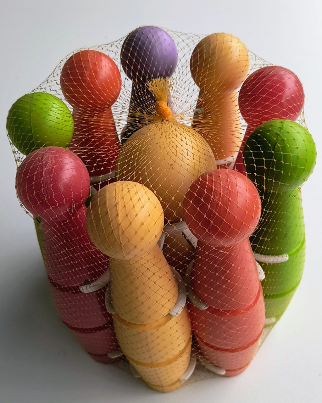 A készlet kilenc bábut tartalmaz, valamint két gömböt, amellyel a játékosok célba vehetik a bábukat. A bábuk mérete és súlya a gyerekekhez van igazítva, így könnyen feldönthetők, ugyanakkor stabilan megállnak sík felületen. A műanyag kialakításnak köszönhetően strapabíró, könnyen tisztítható és biztonságos játék, nem okoz sérülést, ha véletlenül eltalál valakit.