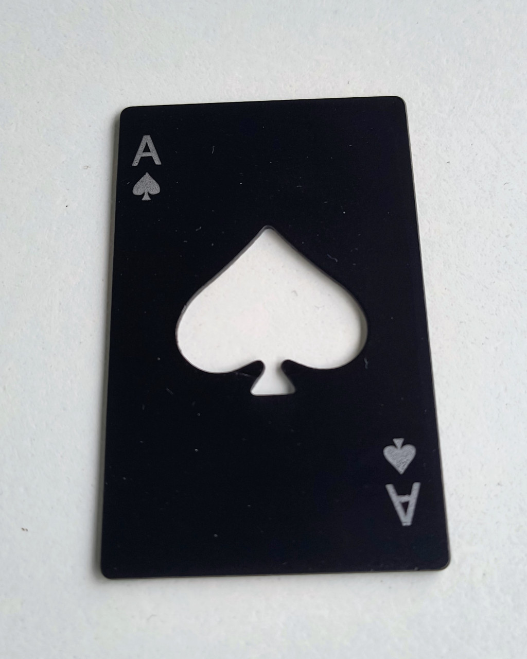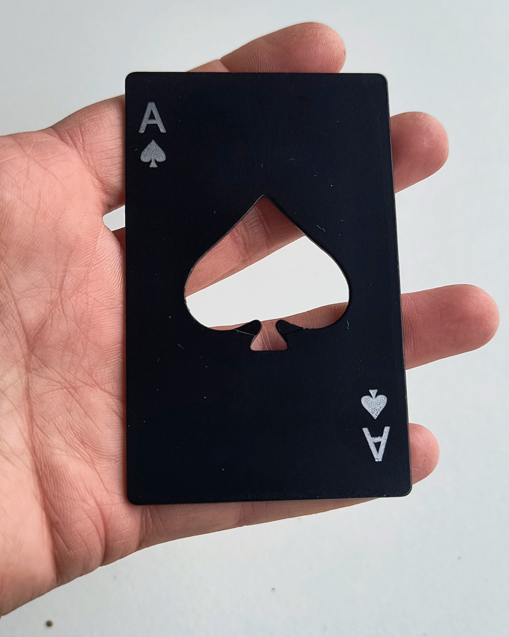 A Pikk Ász sörnyitó egy egyedi, játékos kialakítású sörnyitó, amely a francia kártya pikk ász lapját formázza. Ez a nagyszerű pikk ász sörnyitó fémből készült, bankkártya méretű, így könnyen elfér a pénztárcában vagy zsebben. A lap egyik részén kialakított nyílás szolgál sörnyitóként, így nemcsak praktikus, hanem stílusos is. Ajándéknak is kiváló, főleg kártyajátékokat kedvelők vagy sörrajongók számára. A fekete-fehér dizájn és az ikonikus ász szimbólum különleges megjelenést kölcsönöz neki, miközben jól használható mindennapi kiegészítőként vagy gyűjtői darabként.
